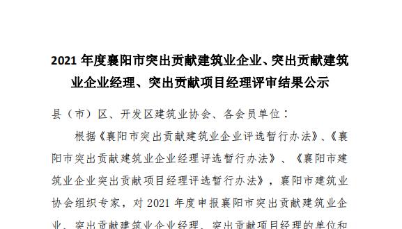 2021年度襄陽市突出貢獻建筑業企業、突出貢獻建筑業企業經理、突出貢獻項目經理評審結果公示.pdf 【查看全文】