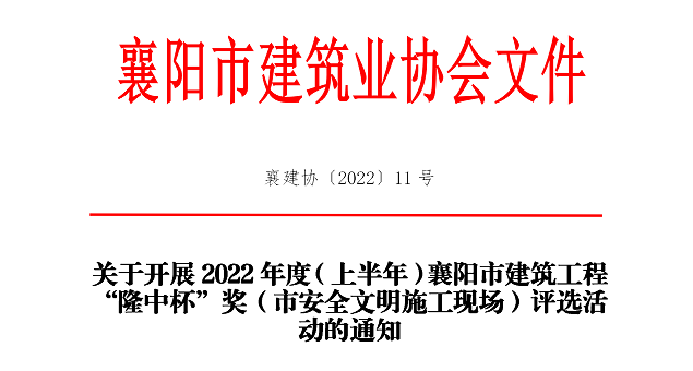 襄建協(xié)〔2022〕11號關于開展2022年度(上半年)襄陽市建筑工程“隆中杯”獎(市安全文明施工現(xiàn)場)評選活動的... 【查看全文】