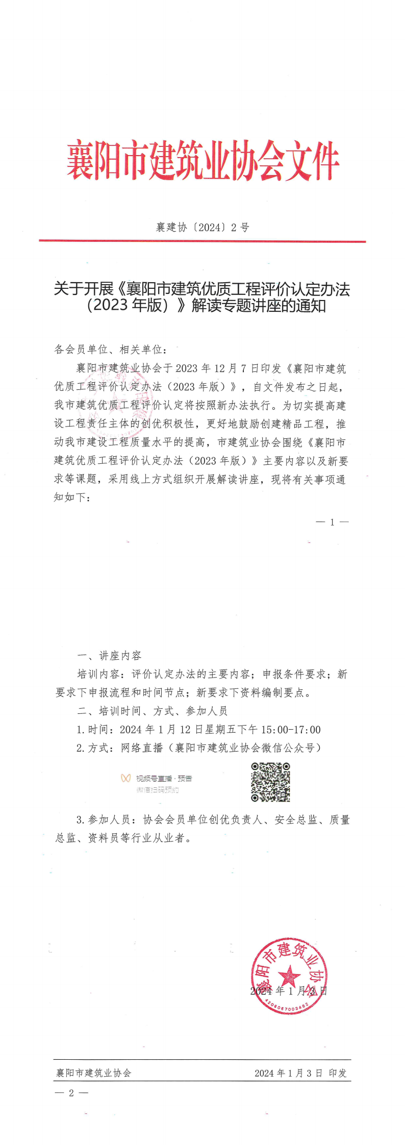 關于開展《襄陽市建筑優質工程評價認定辦法(2023年版)》解讀專題講座的通知