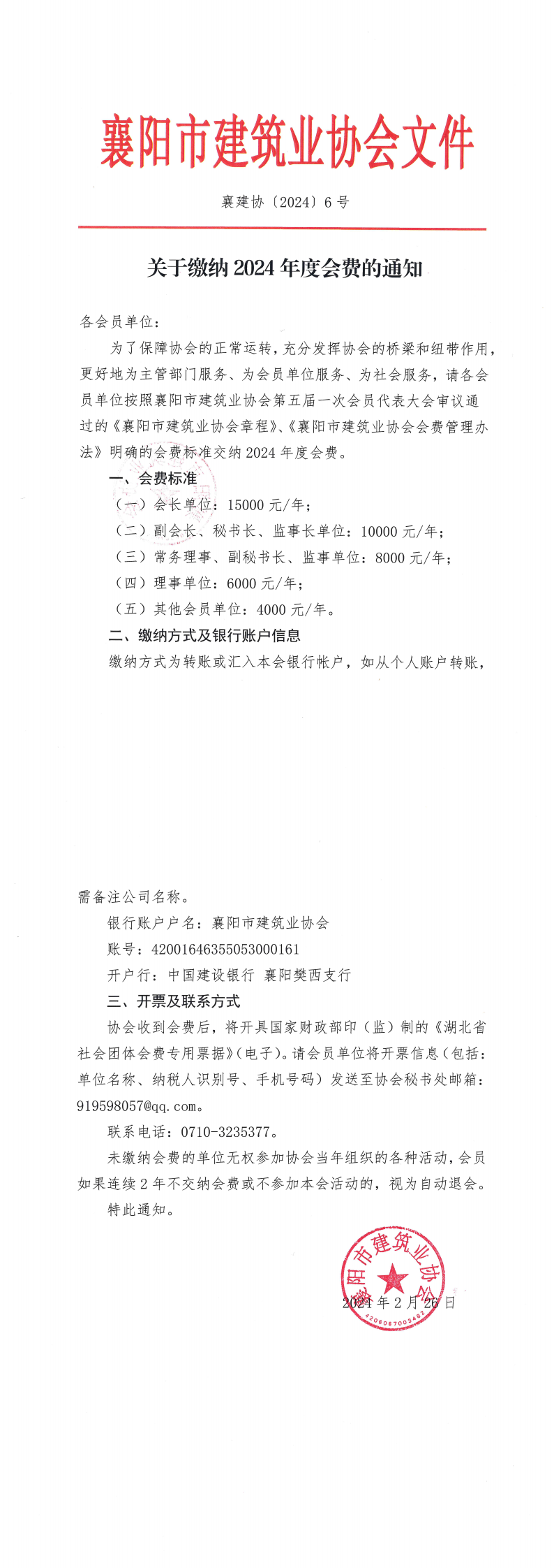 為了保障協(xié)會的正常運轉,充分發(fā)揮協(xié)會的橋梁和紐帶作用,更好地為主管部門服務、為會員單位服務、為社會服務,請各會員單位按照襄陽市建筑業(yè)協(xié)會第五屆一次會員代表大會審議通過的《襄陽市建筑業(yè)協(xié)會章程》、《襄陽市建筑業(yè)協(xié)會會費管理辦法》明確的會費標準交納2024年度會費。
