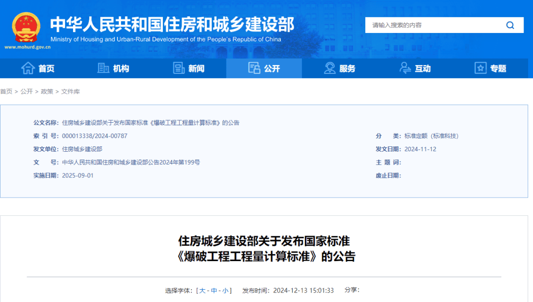 現批準《爆破工程工程量計算標準》為國家標準,編號為GB/T50862-2024,自2025年9月1日起實施。原國家標準《爆破工程工程量計算規范》(GB50862-2013)同時廢止。