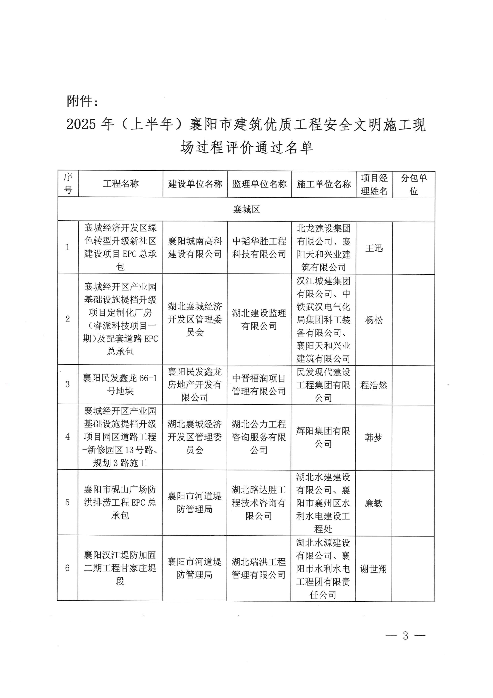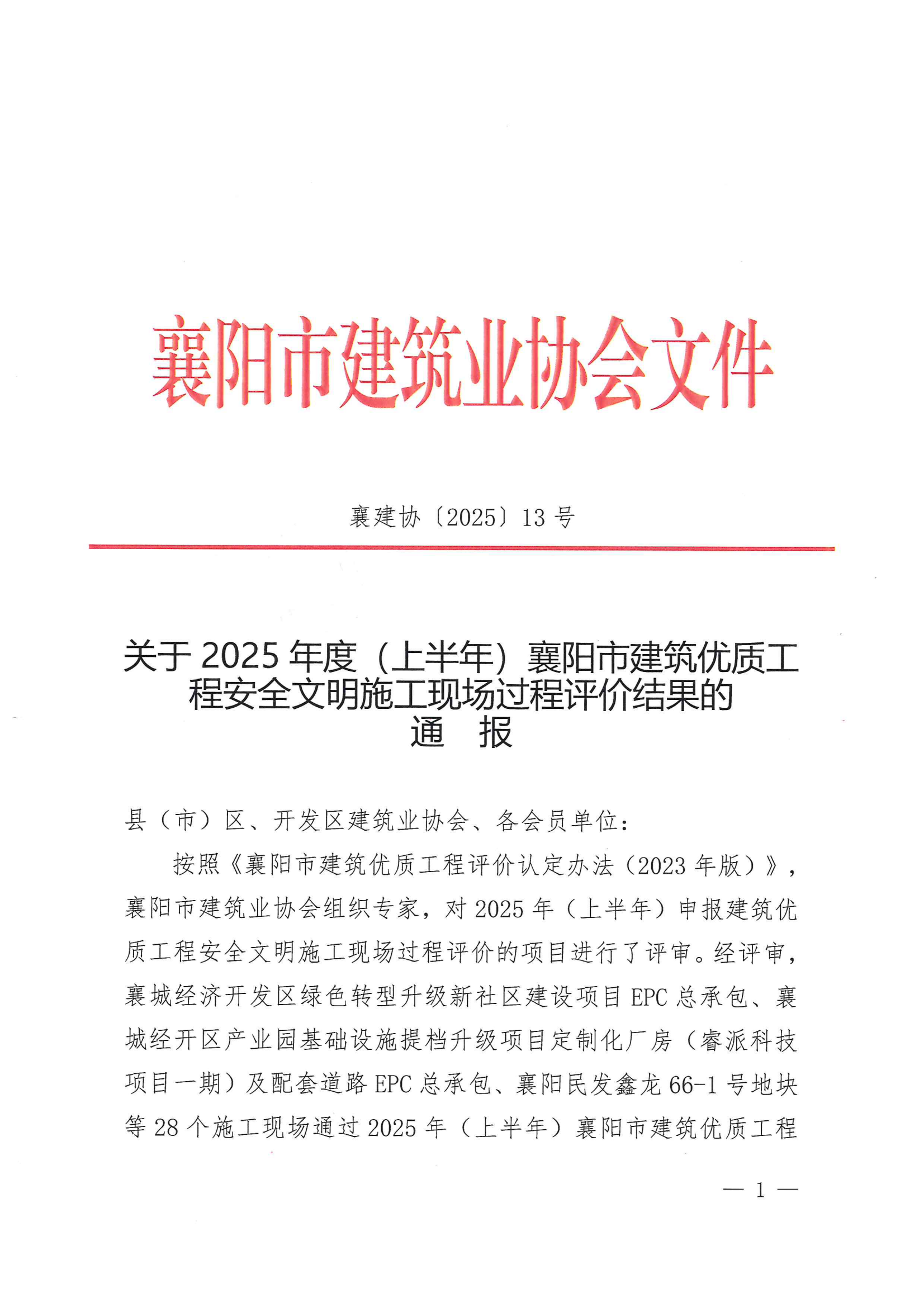關(guān)于 2025 年度(上半年)襄陽(yáng)市建筑優(yōu)質(zhì)工程安全文明施工現(xiàn)場(chǎng)過(guò)程評(píng)價(jià)結(jié)果的通 報(bào)