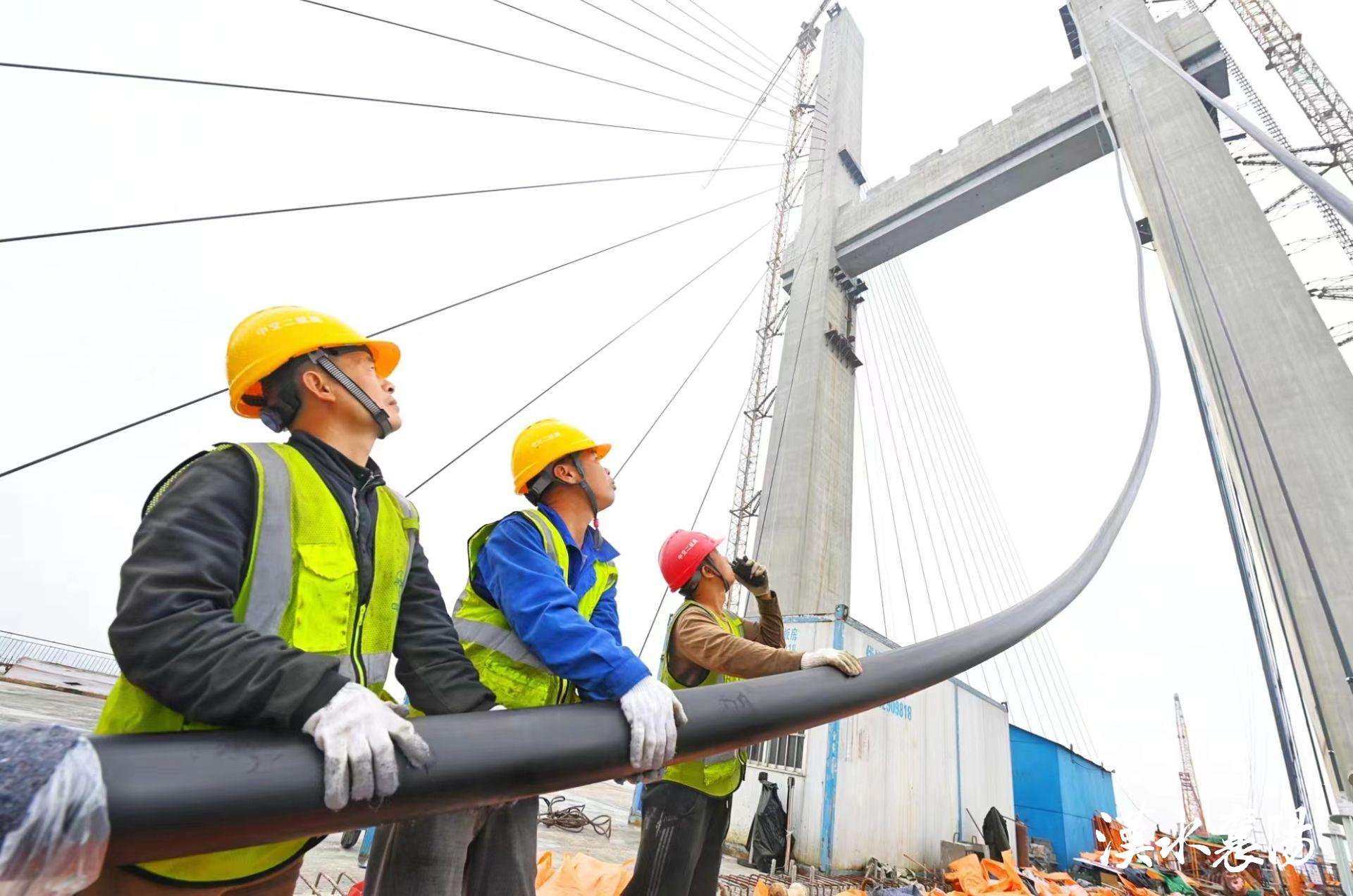 4月7日,中交二航局施工人員正在牛首漢江特大橋安裝斜拉索。