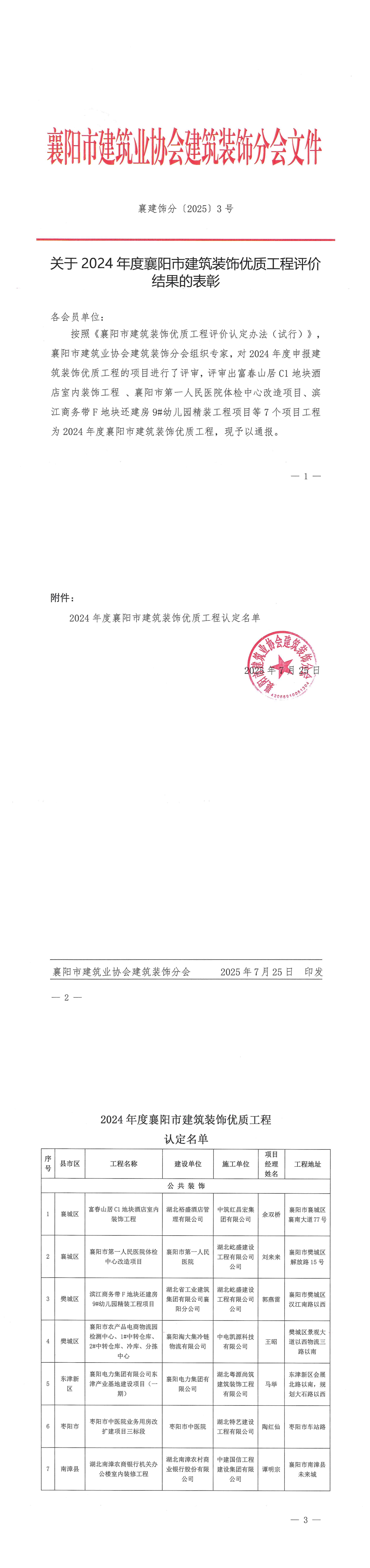 襄建飾分〔2025〕3號 關(guān)于表彰2025年度襄陽市建筑裝飾優(yōu)質(zhì)工程評價結(jié)果的通報