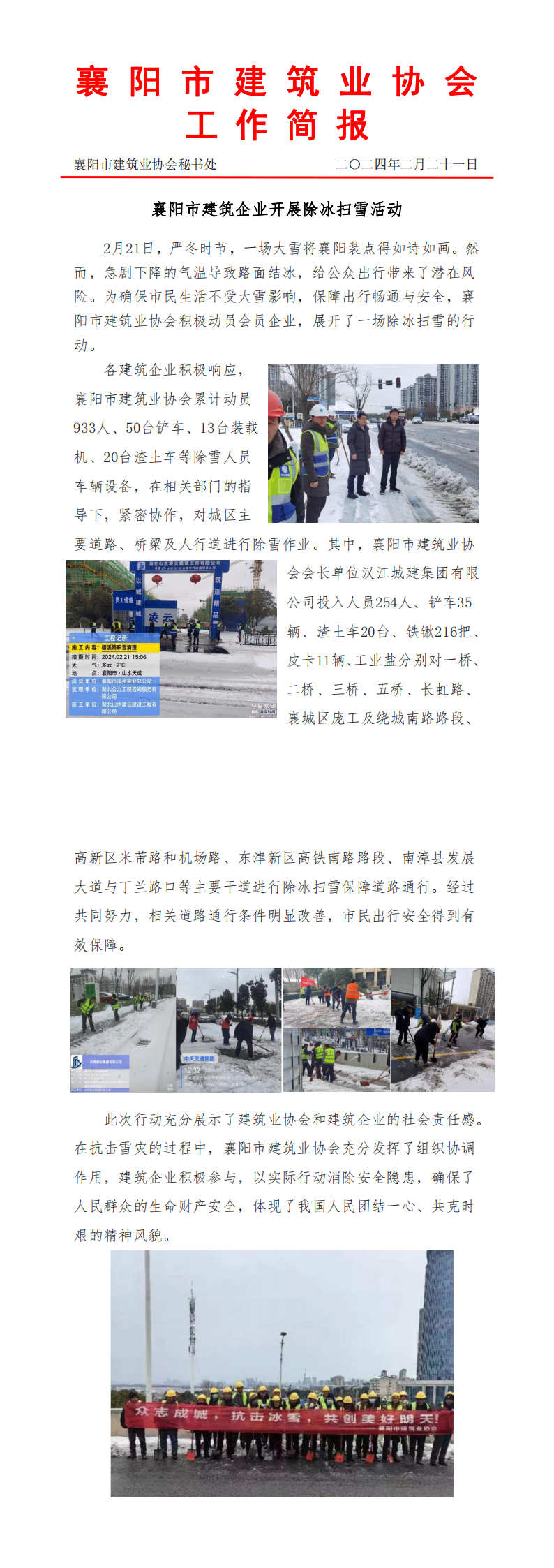 2月21日,嚴冬時節,一場大雪將襄陽裝點得如詩如畫。然而,急劇下降的氣溫導致路面結冰,給公眾出行帶來了潛在風險。為確保市民生活不受大雪影響,保障出行暢通與安全,襄陽市建筑業協會積極動員會員企業,展開了一場除冰掃雪的行動。