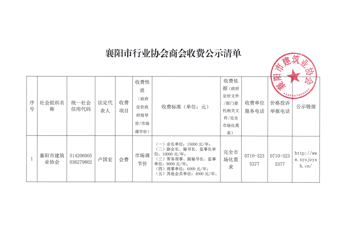 襄陽市行業(yè)協(xié)會商會收費(fèi)公示清單